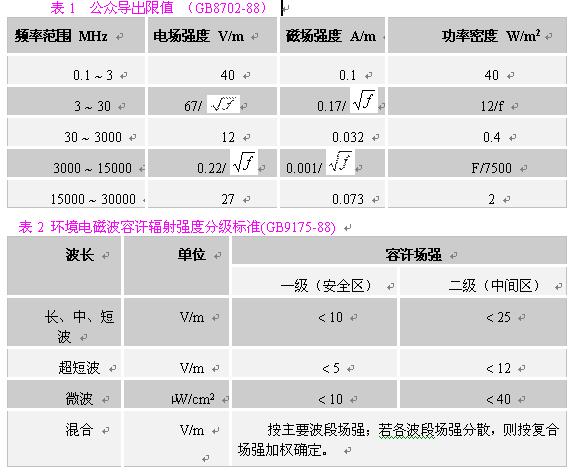 ×î³£Óõĵç´Å·½ÃæµÄ±ê×¼ÊÇ¡¶µç´Å·øÉä·À»¤¹æ¶¨¡·(GB8702-88)¡¢¡¶»·¾³µç´Å²¨ÎÀÉú±ê×¼¡·(GB9175-88)¡¢ ¹¤Òµ¡¢¿ÆÑ§¡¢Ò½ÁÆÉ䯵É豸ÎÞÏßµç¸ÉÈÅ·øÉäÔÊÐíÖµ(GB4824.1-84)¡£¸÷±ê×¼ÏÞÖµÈçÏ¡£